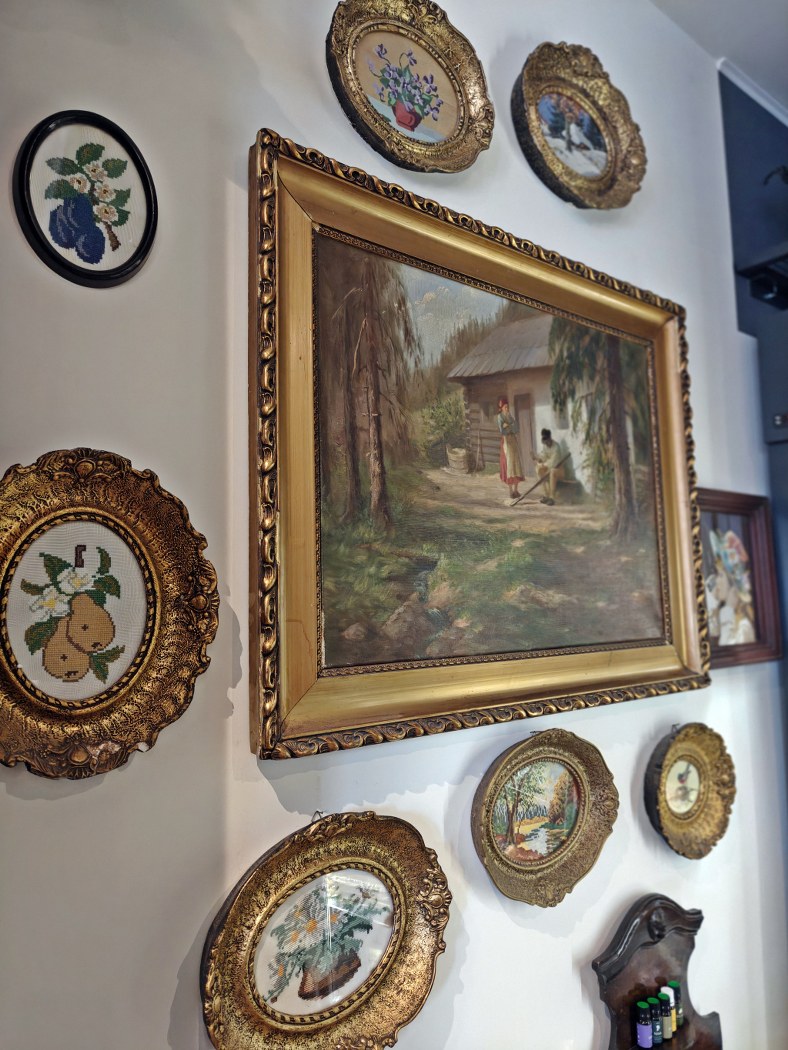 Sve je prepuno detalja i simbolike, od šustikle koju je isheklala Danijelina baka iz Trudelja, sela pod Rudnikom, do uramljenih goblena na zidu, najstarijeg sa motivom šumadijske šljive, čak i ćilima koji je istkala baka Danijelinog supruga, ali i umetničkih slika iz 19. veka sa motivima sa sela.