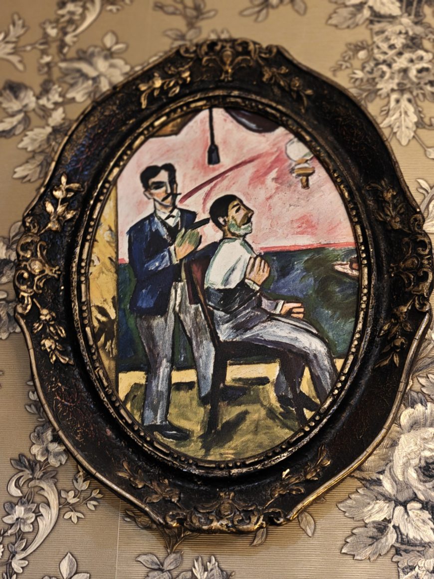 Kad klijenti sednu u stolicu, Vladimir ulazi u svoju ulogu berberina, koji je „zaglavljen“ u nekom davnom vremenu, ali se trudi da što tradicionalnije obavlja taj svoj zanat, pre svega koristeći makaze, umesto mašinice.