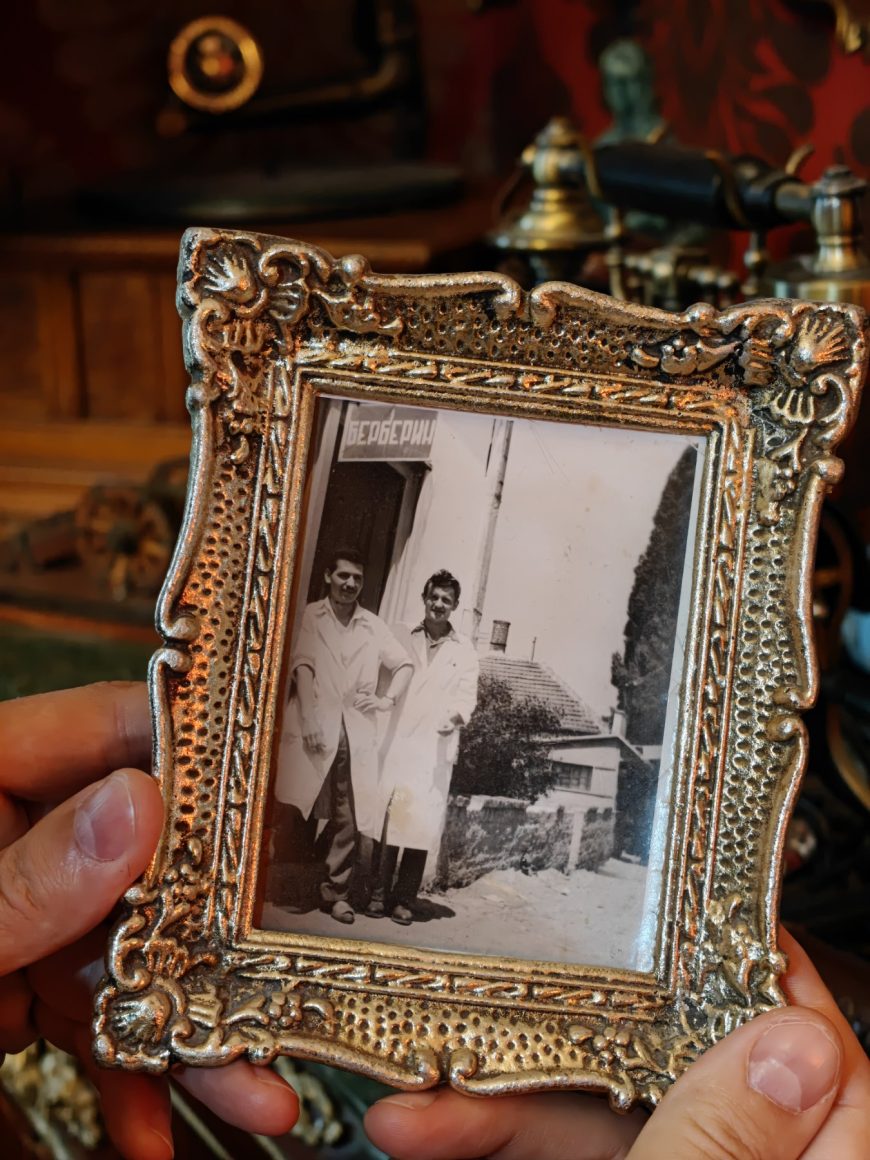 „Ovu stolicu sam nabavio od jednog penzionisanog berberina iz Šapca. On ju je kupio pedesetih godina u Beogradu, gde je stigla iz Budimpešte. Ovakve stolice proizvodile su se u periodu od 1880. do 1920. godine, a mi ovaj raritet danas koristimo kao eksponat ili kad idemo na teren“, pokazuje mi Vladimir.