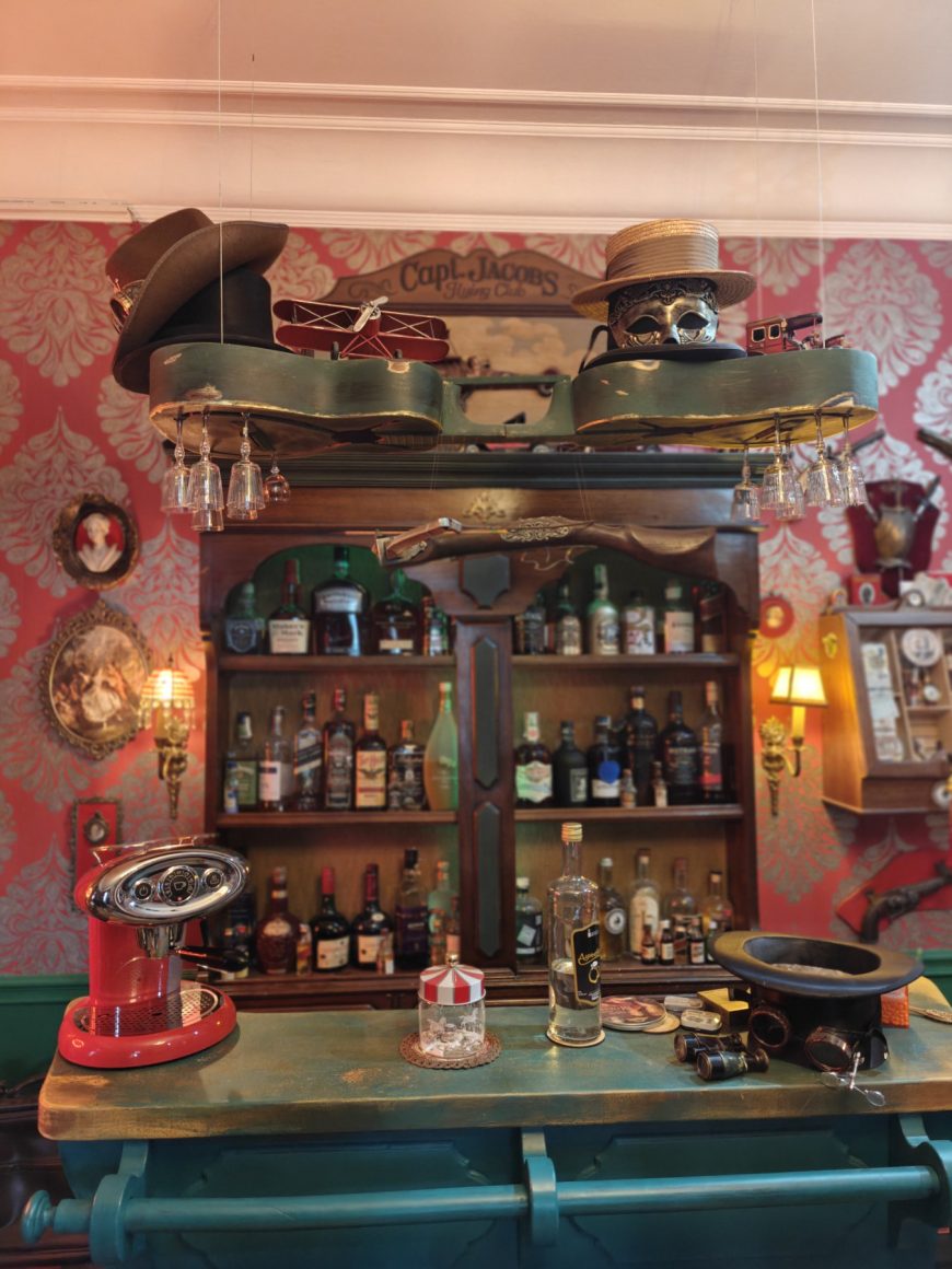 „Šank sam lično napravio i ideja je da ova prva prostorija bude prijemna soba u kojoj će ljudi da se okrepe i popiju nešto pre šišanja ili brijanja. Bar je samoobnovljiv, prvo piće je besplatno, a gosti mogu da ostave novac u šešir za svako naredno.“