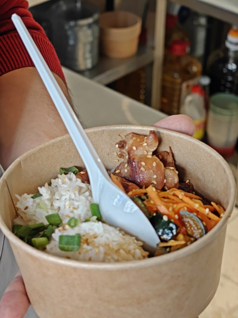 U lokalu Osh možete probati plov sa piletinom, junetinom ili posan. Pokazuju mi i opciju sa piletinom u soja sosu, sa takozvanim „lomljenim krastavcem“ koji se pre spremanja toliko izgnječi da promeni strukturu.